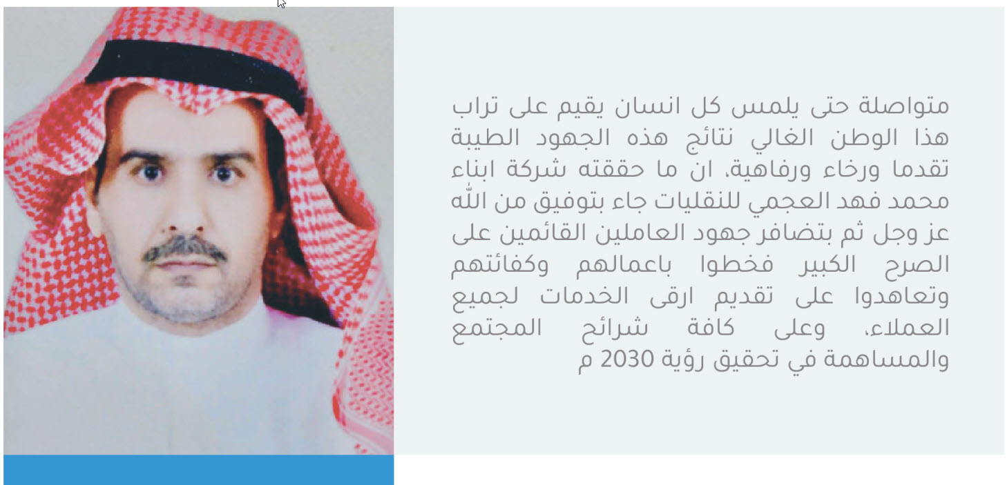 شركة أبناء محمد فهد العجمي رائدة بزغ نجمها في سماء الشركات السعودية ووضع حجر الأساس لشركة محمد فهد العجمي في عام 1980. وجاء حافز بدء المؤسسة من رغبة السيد محمد فهد العجمي (رحمه الله ) في تحسين مرافق النقل في المملكة لتكافئ المعايير العالمية حتى يزدهر الوضع التجاري ووضع الأشخاص على النحو الأمثل. وبدء الأسطول بداية متواضعة وتكون من عدة شاحنات قليلة، لكن صارت الشركة معروفة حاليًا بأنها أكبر مقدمي الخدمة في القطاعات المهنية للنقل والتخزين يقر مقرنا الرئيسي في الدمام ولدينا فروع في الرياض وجدة والجبيل. وجعلت خدماتنا الفائقة مكانًا خاصًا لنا في وجدان عملائنا الكرام الذي نعمل على الإجابة على استفساراتهم وحل مشكلاتهم في أسرع وقت من خلال مكتب دعم العملاء لدينا الذي يعمل طوال أيام الأسبوع وعلى مدار اليوم. ونهدف إلى تطوير خدماتنا إلى المستوى التالي بحلول عام 2014 من خلال دمج مجموعة من الخدمات التي من شأنها أن تكمل مجموعة خدماتنا الحالية ومساعدة العملاء على تحقيق أهدافهم الإستراتيجية بأسعار تنافسية وأسلوب فعال وفي وقت محدد. ونحن دائمًا على استعداد لبذل مزيد من الجهد لتسهيل حياة عملائنا وتعزيزها من الناحية المهنية.